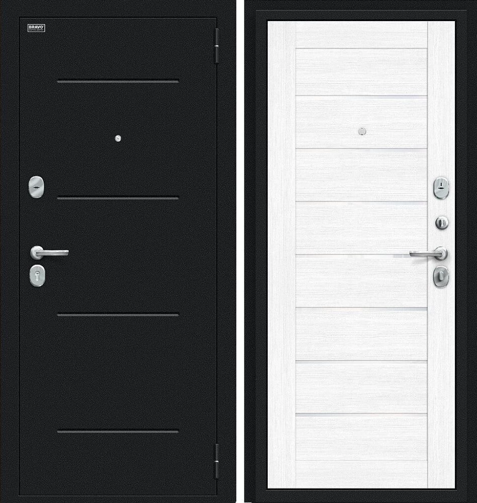 Надежная входная Дверь Браво Техно Букле черное/Snow Melinga премиум класса по цене 37 110 руб. Большая толщина стали защитит от проникновения в ваш дом, квартиру или коттедж. Используется очень качественная фурнитура: замки, цилиндры, ручки, защелки. Покрытие и отделка двери изготовлено под внимательным контролем производителя. Дверь имеет долгий срок службы и гарантию.
